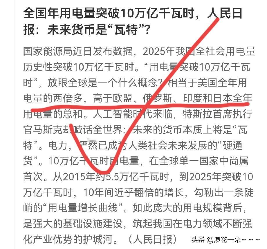 厉害了,我的国! 据人民日报:未来的货币是“瓦特”?我们全年用电量已经突破10万亿千瓦时,已经是美国的两倍。 我想这个数字可能是5年前或10年前绝大多数人都没有想到的吧。 何况我们这个用电量好多都是来自绿色能源,比如说光伏发电和风电发电。 其实,最让美西方羡慕的是假以时日我们的工厂企业都用上了绿色电力,他们该怎么办? 所以说,像马斯克这样的伟大企业家,他们就很羡慕咱们有用不完的电力,电力是工业的血液,便宜的电力更是工业利润增加的基础,这不充分说明了瓦特就是货币吗? 再进一步说,如果未来国际货币体系能够锚定“碳能量”和“碳价值”的话,那西方眼珠子真是瞪出来了,毕竟,美元还有啥信用?电力所体现的生产能力才是信用。[捂脸]