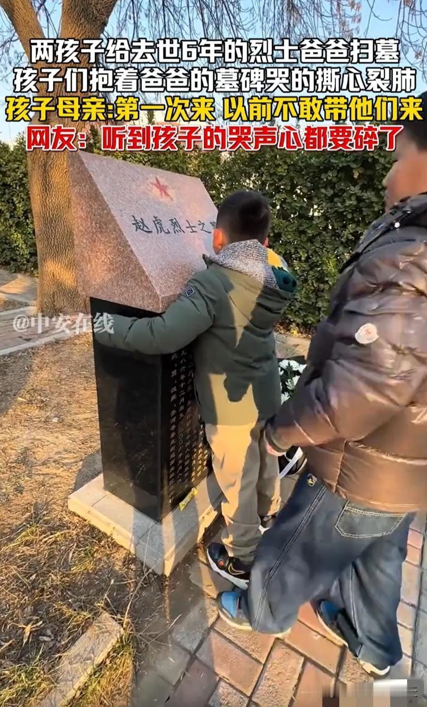 看哭了,山东一妈妈带着两孩子,第一次去给去世6年的烈士爸爸扫墓,不料去的路上孩子们满怀期待,可来到烈士爸爸墓碑前时,两个孩子平日里所有的坚强瞬间碎了,抱着爸爸的墓碑就开始撕心裂肺的哭。 六年前,两个孩子的父亲,名叫赵虎的山东籍军人,在执行任务时牺牲。那时两个孩子还太小,母亲一直不敢带他们来扫墓。她怕孩子承受不住那份巨大的悲伤。六年过去,她觉得孩子也许长大了一些,懂事了一些,才终于鼓起勇气,妈妈第一次带两个孩子来到烈士陵园给爸爸扫墓当弟弟摸到冰冷石碑的那一刻,小小的手臂环抱着石碑,脸颊贴着冰冷的石面。 起初是压抑的抽泣,后来哭声再也抑制不住,后面哥哥也抱在一起哭泣,这种场面妈妈看了也很心碎!谁能忍住不心疼?有网友说看了视频让人心酸啊!孩子是看到别的小朋友有爸爸陪伴时心底的渴望都变成了遥不可及的思念与遗憾。爸爸再也不能回来抱他们、也是一个家庭永远的缺失,妈妈心酸独自撑起生活的琐碎,孩子在成长中缺少了父爱的陪伴,那些本该共享的团圆时刻,都变成了藏在心底的牵挂。愿英雄的孩子能被世界温柔守护。 其实这样的故事还有很多。去年看到安徽一位烈士的女儿,在高考志愿里填报了爸爸曾经服役的城市,她说想离爸爸近一点;还有河北一位烈士的儿子,把爸爸的军功章当成最珍贵的宝贝,每天睡前都要摸一摸。这些孩子用自己的方式,纪念着从未真正陪伴过他们的父亲。烈士为国家和人民献出了生命,他们的家人不该独自承担这份沉重。这些年各地退役军人事务部门一直在行动,上门走访、学业帮扶、就业支持,可除了政策层面的保障,社会的温暖更不能缺席。学校老师多一份关心,多一句问候、也能成为他们生活里最温暖的动力。 英雄用生命守护家国,我们就该守护好英雄的家人。那些撕心裂肺的哭声,是对父亲的思念,也是对亲情的渴望。希望每个烈士家庭都能被温柔以待,希望孩子们在成长路上能感受到更多温暖,让他们知道,爸爸的精神一直都在,还有无数人在默默爱着他们、支持他们。这世上最动人的从来不是惊天动地的壮举,而是对英雄的铭记,对家属的关怀这才是对烈士最好的告慰。致敬英雄,英雄从未走远![祈祷][祈祷][祈祷][玫瑰][玫瑰][玫瑰]