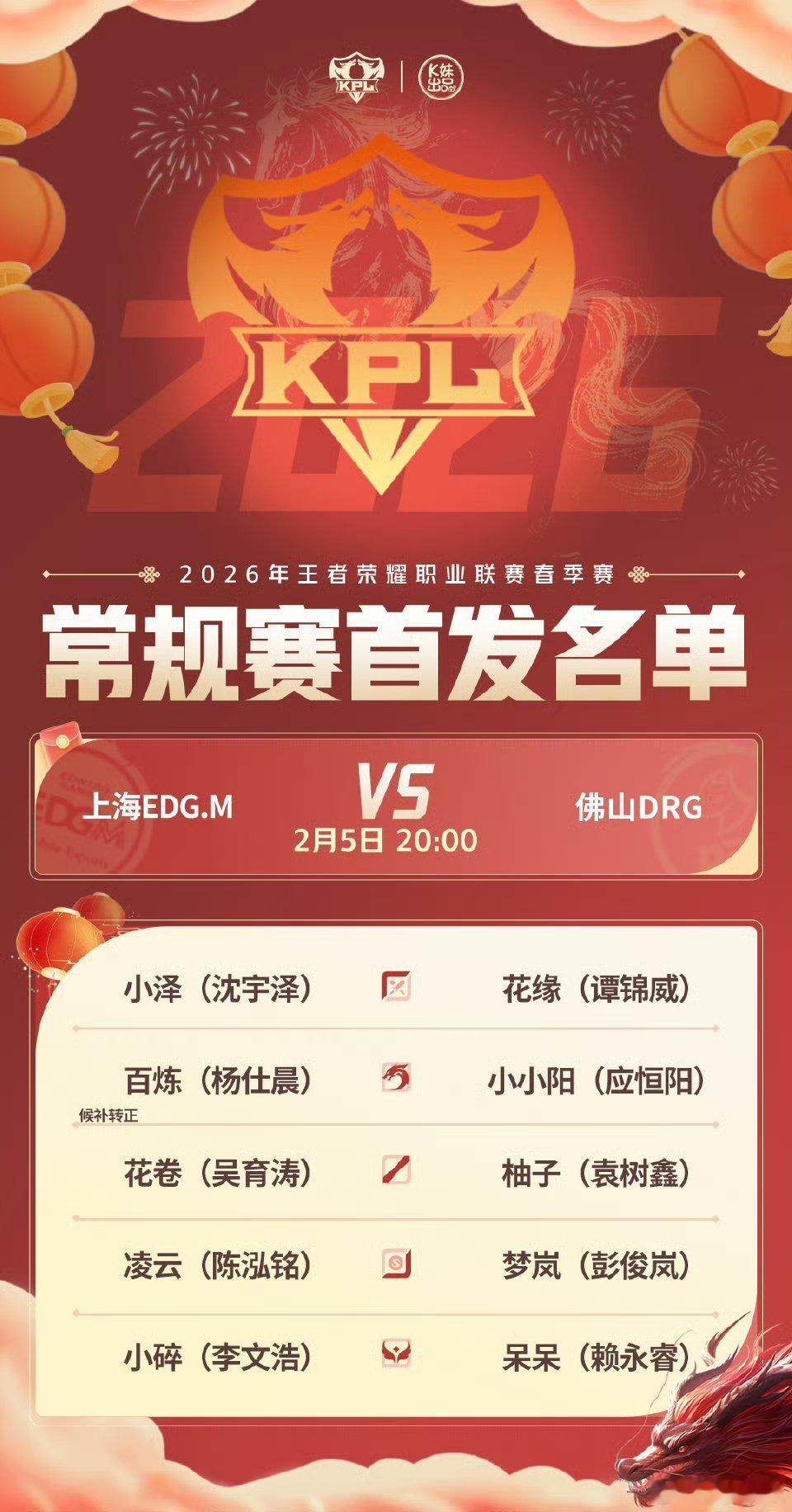 2026KPL春季赛今日首发名单