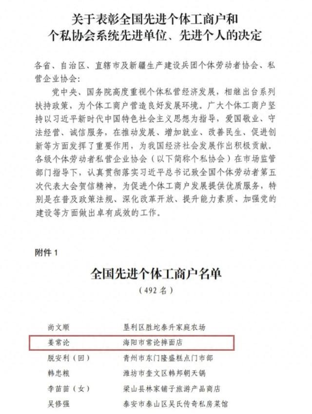 近期,中国个体劳动者协会印发《关于表彰全国先进个体工商户和个私协会系统先进单位、先进个人的决定》,海阳市常论摔面店荣获“全国先进个体工商户”称号。这一成绩的取得,充分彰显了我市在服务个体私营经济发展、优化营商环境方面的扎实成效。