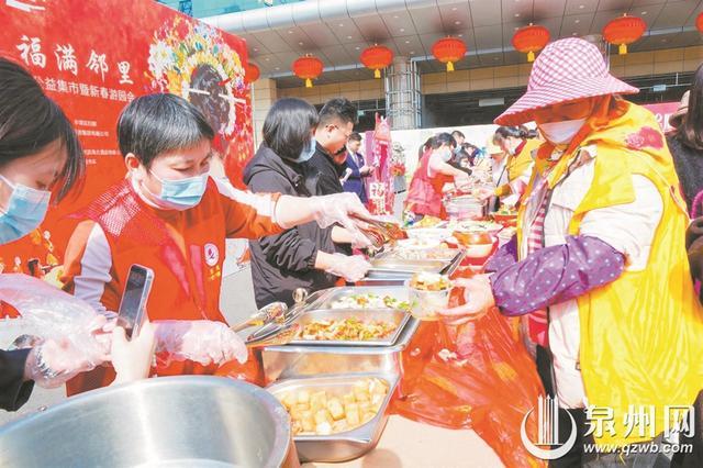 “簪花筵”摊位人气满满,现场展示的特色菜品精模独具匠心美学;讲解员解读文化与工艺,免费美食则让居民品鉴舌尖上的闽南年味。簪花围头饰与主题打卡手举牌吸引众人拍照,定格新春笑脸。