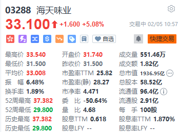 上证报中国证券网讯(记者何漪)2月5日,港股消费板块表现活跃,泡泡玛特一度涨超5%。截至10点57分,海天味业H股涨逾5%,泡泡玛特涨幅回落至1.85%,海底捞涨逾2%。