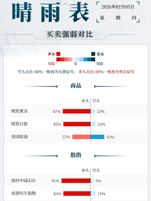 昨晚发布的美国1月“小非农” 数据意外不及预期, 金银日内再坐“过山车”; 美国财政部维持发债策略不变; 伊朗外长确认周五 举行伊美核谈判…… 后市金融市场的情绪如何? 通过下图的数据,可以明显看出: 黄金的多头比例为87%, 空头比例为13%; 白银多头比例为85%, 空头比例为15%。 黄金和白银的多头比例,都超过80%的分界线!