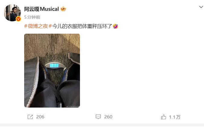 微博之夜出图定格阿云嘎拖地皮衣造型,黑调皮衣尽显简约酷感,他现场自曝体重,为亮相
