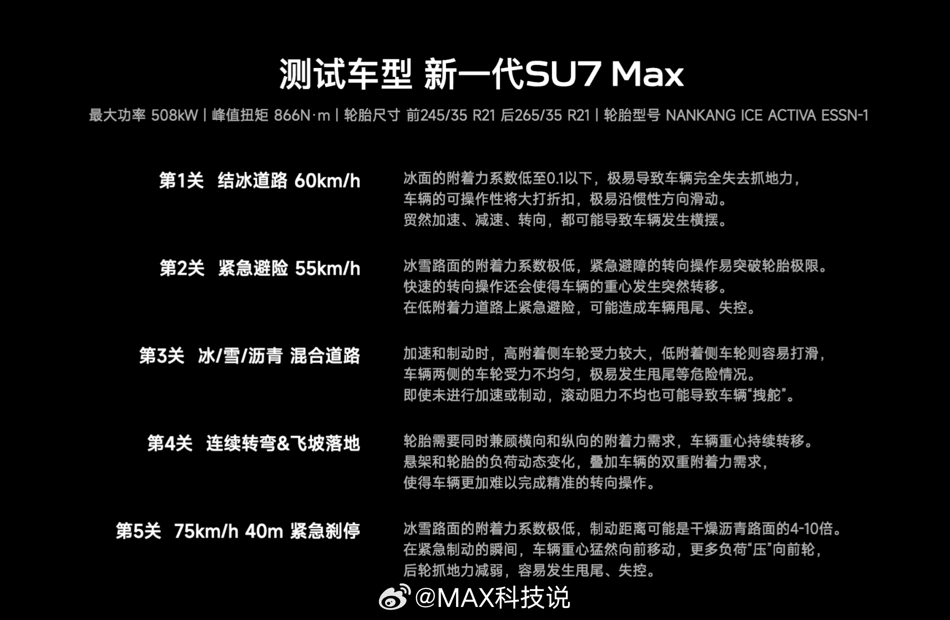 小米做了-39℃的五大冰雪挑战:结冰道路、紧急避险、冰/雪/沥青 混合道路、75km/h 紧急刹停、连续转弯以及飞坡落地。