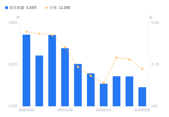 日期A股户数(户)流通A股户均持股数(股)户均持股市值(万元)2026-01-30333658206.729.072026-01-20341458019.259.122026-01-10341578016.439.162025-12-31336218144.238.622025-12-19343637968.378.622025-12-10350367815.318.692025-11-28361687570.708.922025-11-20371187376.948.992025-11-10356477681.359.392025-10-20371457371.589.07
