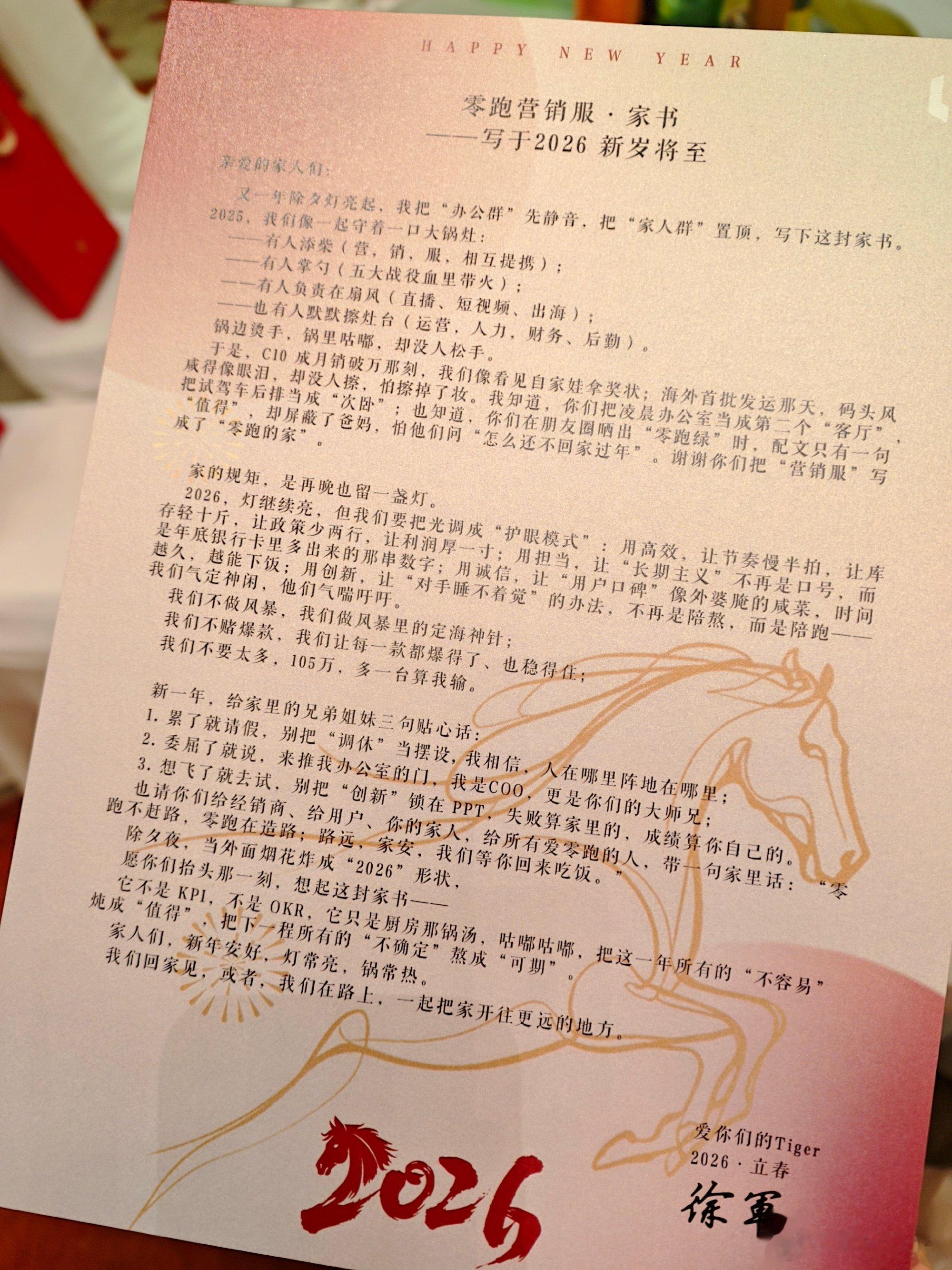 2月5日午间消息,零跑汽车COO徐军@零跑Tiger微博晒出“写给零跑营销服的家书”,其中提到,2026年要让灯继续亮,不过把光调成“护眼模式”:用高效让节奏慢半拍,让库存轻10斤、让政策少两行、让利润厚一寸。