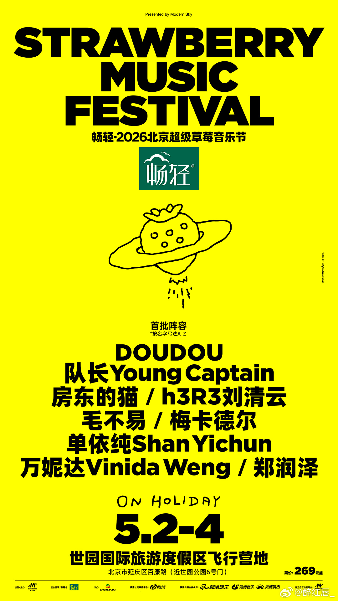 北京草莓音乐节首批阵容 北京草莓首批阵容直接炸场! DOUDOU、队长Young Captain、房东的猫、h3R3刘清云、毛不易、梅卡德尔、单依纯ShanYichun、万妮达Vinida Weng、郑润泽,全是顶流,这波太顶了!
