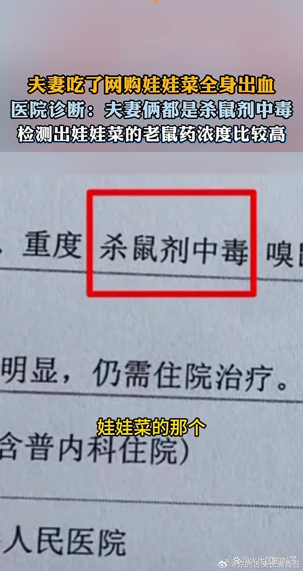 2025年12月,浙江天台县一对夫妻陈某波和杨某,因食用网购的娃娃菜后中毒送医,初步诊断结果为杀鼠剂中毒。