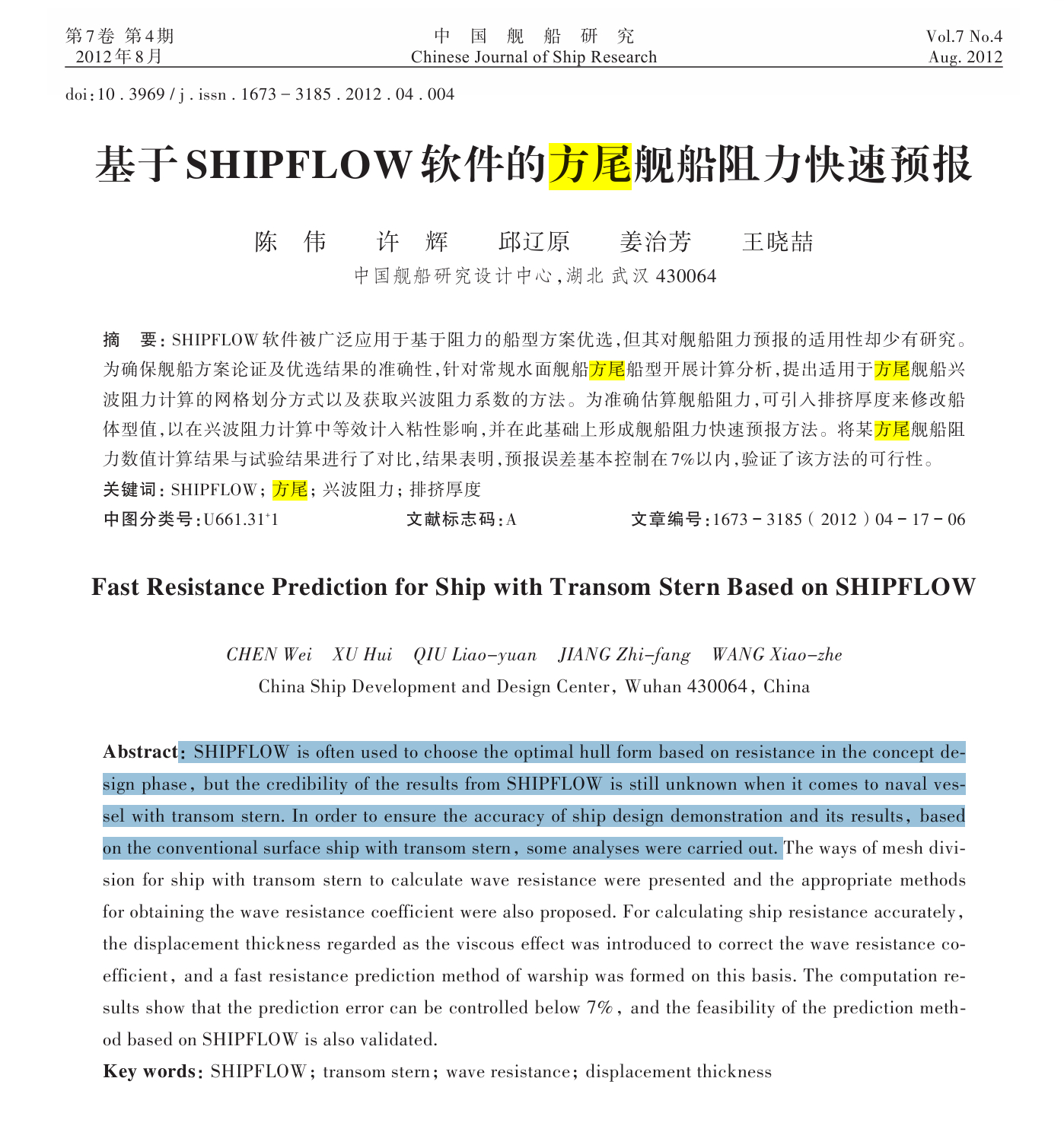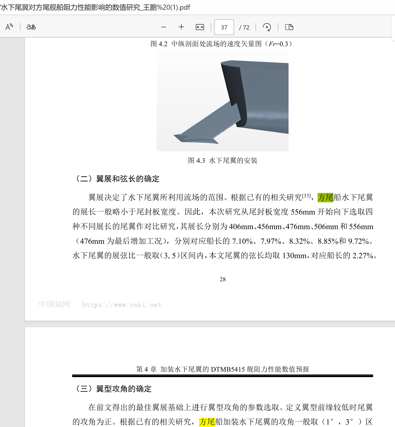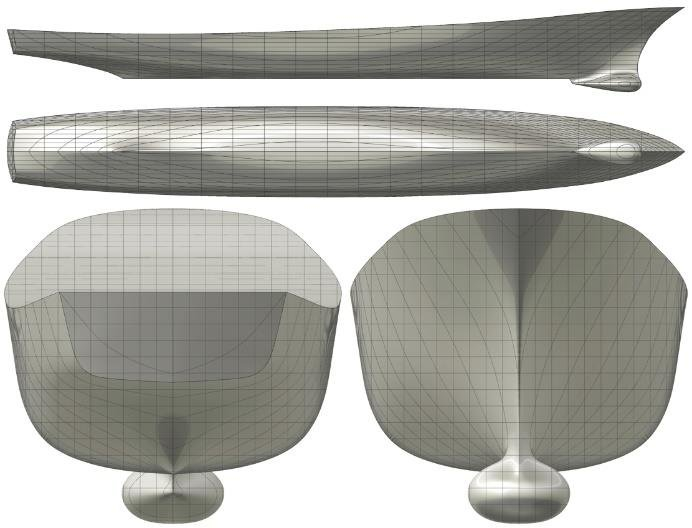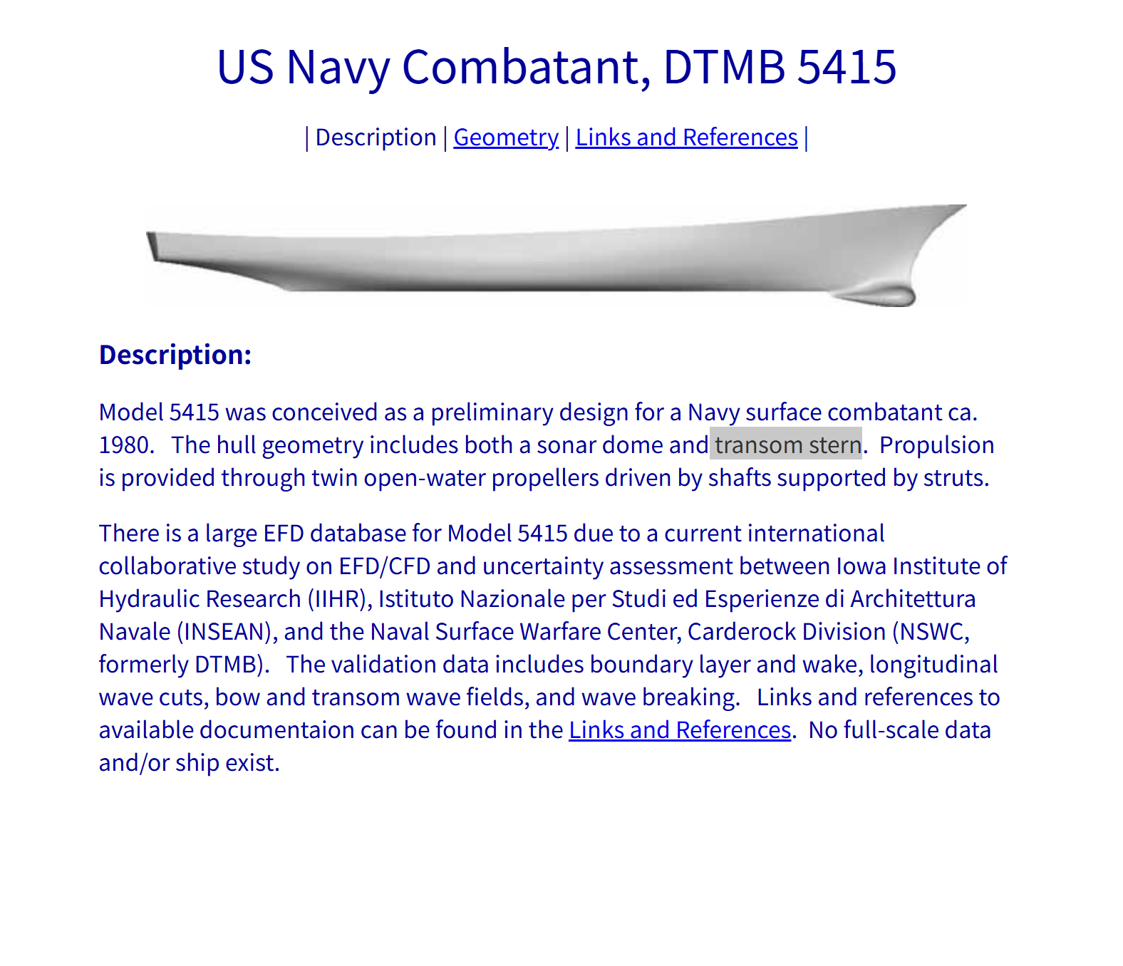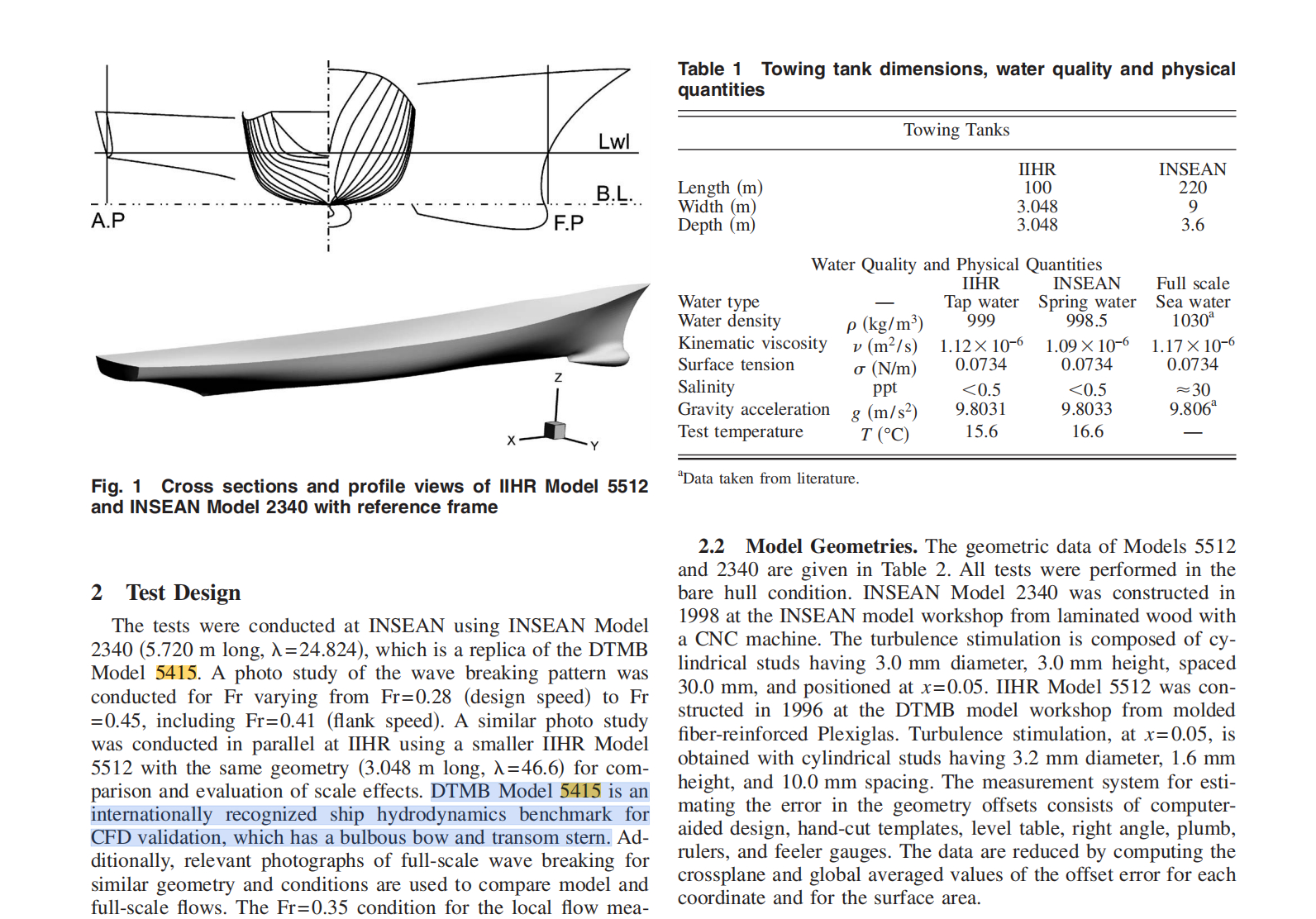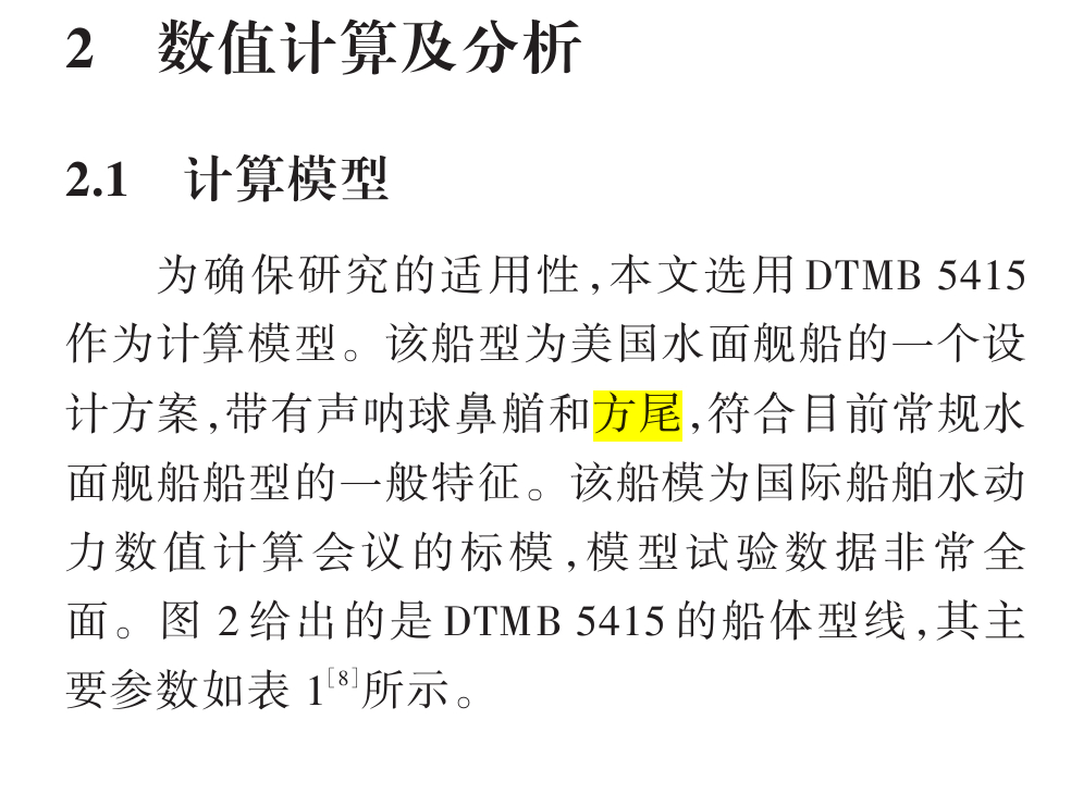 典型的采用 “方尾” 或 “方艉” 的舰船模型是5415模型,该模型基于伯克级驱逐舰船体改进开发而来,是目前国内外船舶学界广泛采用的高速舰船模型,其造型和中英文介绍可见图3-6和网页链接