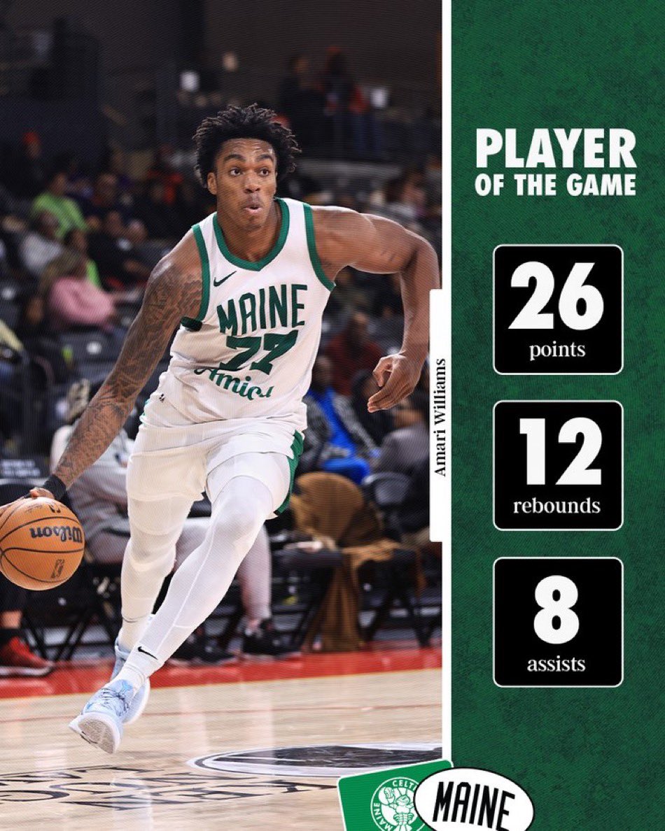 全场比赛,凯尔特人球员阿马里-威廉姆斯出场39分钟,得到26分12篮板8助攻1盖帽,投篮16中10。