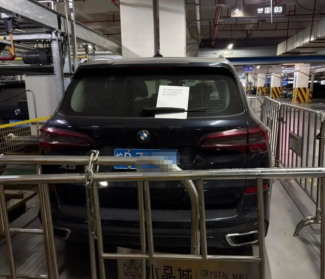记者从网传的图片上看到,这辆黑色的皖牌宝马四周都是围栏,后窗上还贴有一张纸,上面写着:“移车请联系水晶城消控24小时值班电话……”而另一张图片上可见,该车入场时间是2025年3月1日凌晨2时许。