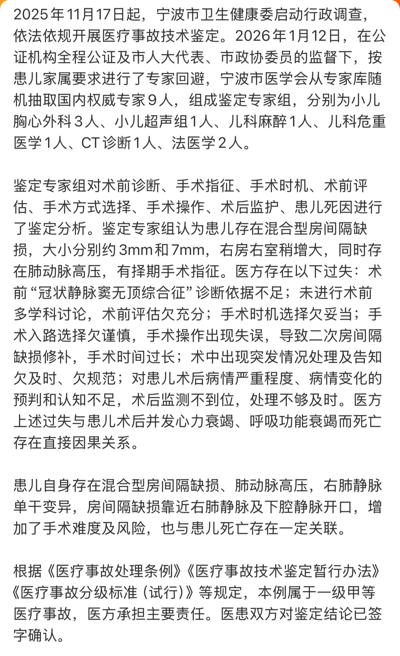 几个关键点:第一、参与认定的专家是从全国专家库随机抽取的9位第二、整个医疗团队都存在过失,但主要集中在评估不足和手术时机以及操作上面的不足,没有直接故意的情况存在第三、患儿本身的病症也和患儿的死亡有一定关联第四、之前大家质疑的很多情况,根据专家组的鉴定,大多数都没有违反诊疗常规第五、监控摄像配置符合相关规定第六、按照一级医疗事故对相关责任人进行了处理。这个调查结果算尘埃落定,希望逝者一路走好小洛熙事件最新通报宁波女婴术后离世调查处置情况热点观点 小洛熙事件最新通报