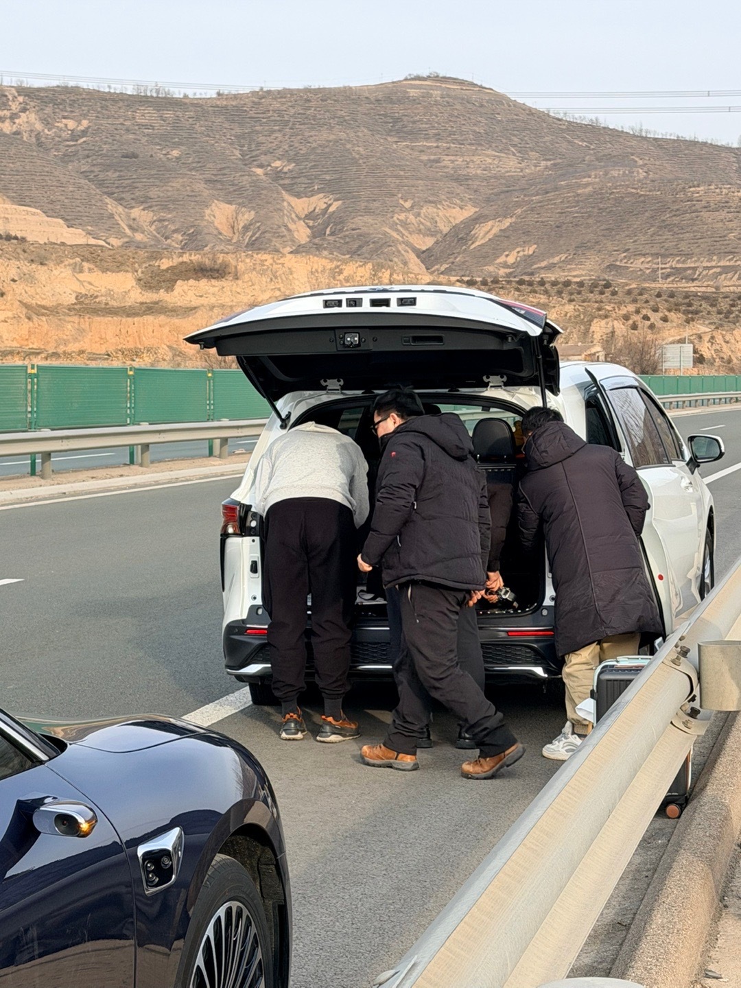 高速我们遇到了扎胎考验团队配合了日系车有备胎我们新能源断后负责警示保护三脚架重要