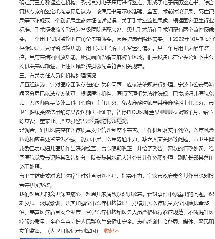 宁波女婴术后离世调查处置情况 家属可以拿着卫健委的责任认定,去法院起诉了,追究相关医生的医院的民事、刑事责任