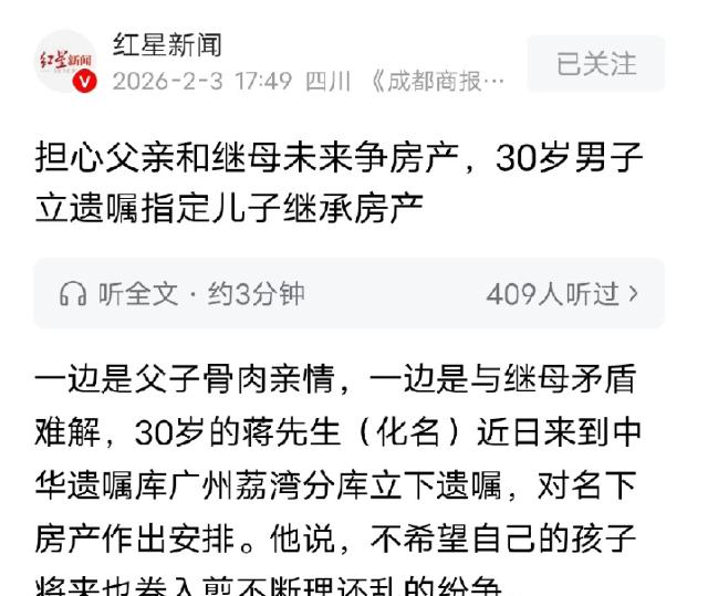 三十岁立遗嘱, 怕爸和继母分房, 儿子能保住吗。 广州一个30岁的小伙子,刚当爹不久,就跑去立遗嘱。 房子是妈妈和外婆出钱买的,婚前财产。 他爸中风后,继母牵头告他要赡养费,法院判他每月给500块。 他不是不想尽孝,但真怕自己哪天走了,那套房会绕过儿子,落到继母手上。 法律上,爸确实是第一顺位继承人,哪怕关系再僵,不自动失效。 而继母只要和爸没离婚,就可能通过婚姻关系间接影响财产。 他选了最稳妥的招:把房直接留给儿子,让亲妈当遗产管理人。 不吵不闹,也不提旧账,就按规则办事。 这事儿没谁对谁错,就是现实摆在这儿——赡养该付的得付,钱不付不行;财产想给谁,也得趁清醒早安排清楚。 他写完遗嘱,签完字,就回单位上班去了。