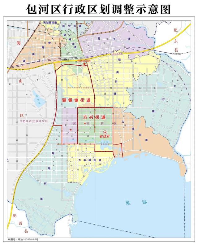 经省委、省政府和市委、市政府研究同意,调整包河区常青、望湖、骆岗、义城、烟墩、万年埠6个街道管辖范围,设立包河区驷佩塘街道、方兴街道。调整后,驷佩塘街道办事处驻清枫社区,方兴街道办事处驻新胡李社区。详情可参考示意图。