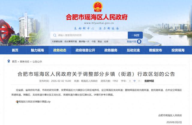 2月2日,合肥市瑶海区人民政府发布合肥市瑶海区人民政府关于调整部分乡镇(街道)行政区划的公告。