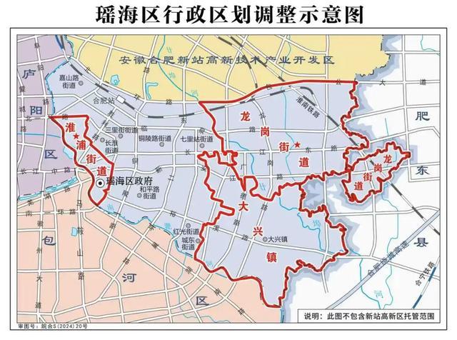 经省委、省政府和市委、市政府研究同意,变更瑶海区大兴镇部分行政区域界线,设立瑶海区龙岗街道;撤销瑶海区明光路街道、胜利路街道,合并设立瑶海区淮浦街道。调整后,龙岗街道办事处驻王岗社区,淮浦街道办事处驻红旗社区。详情可参考示意图。