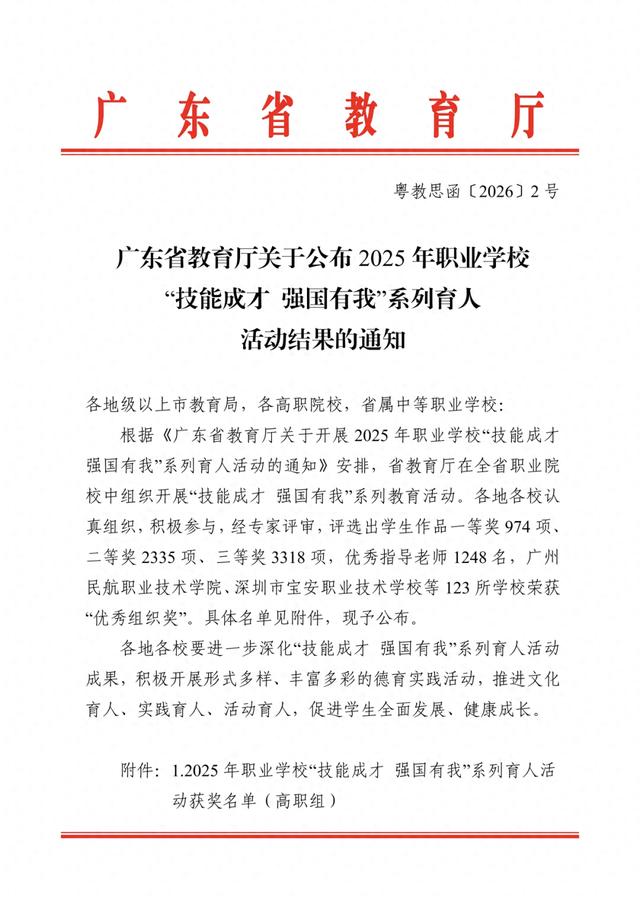 近日,广东省教育厅发布《广东省教育厅关于2025年职业学校“技能成才强国有我”系列育人活动结果的通知》,云浮中专在此次系列育人活动中,共选送作品27项,其中25项获奖,获奖率高达92.59%,累计斩获荣誉33项!其中一等奖6项、二等奖11项、三等奖8项,8名教师荣获“优秀指导教师”称号。