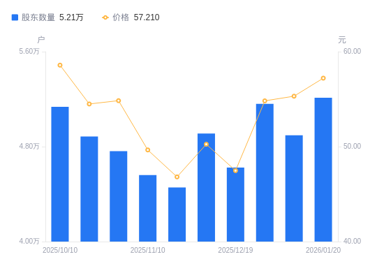 日期A股户数(户)流通A股户均持股数(股)户均持股市值(万元)2026-01-20521118573.5949.052026-01-09489589125.7550.472025-12-31515968659.1747.472025-12-19462429661.7545.862025-12-10491079098.0645.722025-11-284455410027.8046.942025-11-10456059796.7048.642025-10-31476249381.3751.452025-10-20488499146.1149.842025-10-10513528700.3150.97