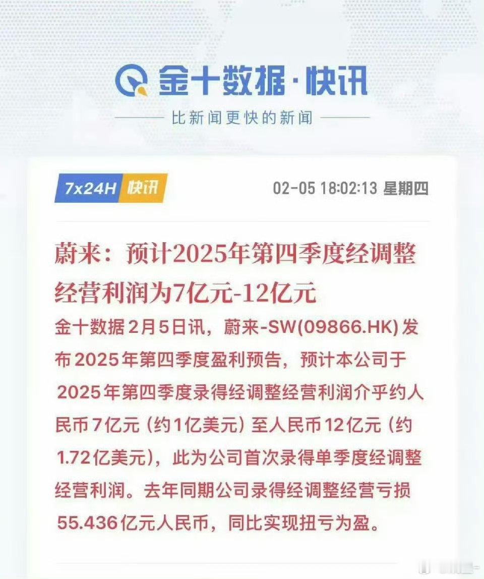 蔚来四季度首次盈利蔚来预计,2025年第四季度将录得经调整经营利润约人民币7亿元至12亿元,这也是蔚来首次实现单季度经调整经营利润,扭亏为盈,好事!