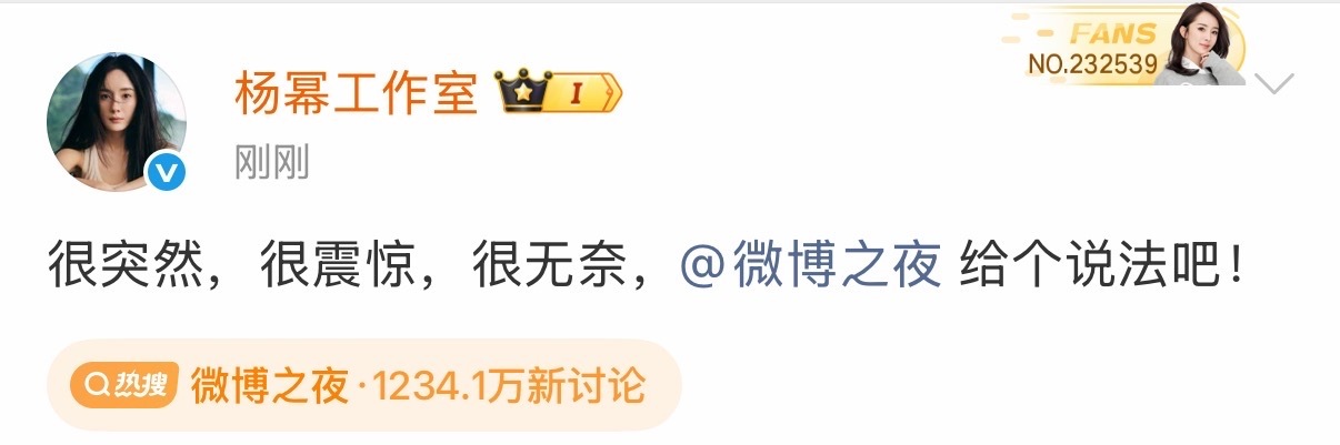 杨幂工作室喊话微博之夜要回应后,微博之夜第一时间发文给出了回应。说是工作人员复查