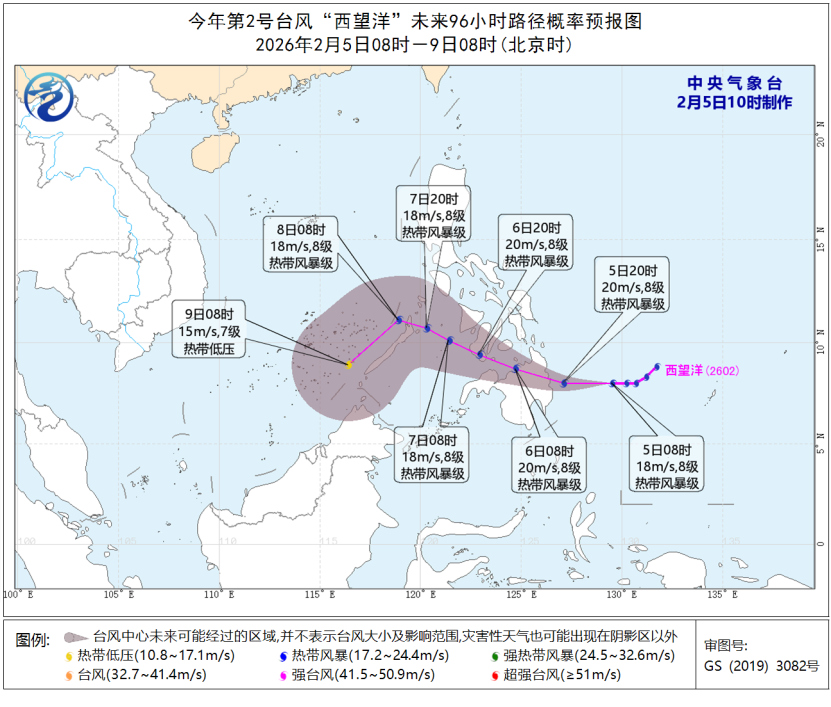 预计,“西望洋”将以每小时20-25公里左右的速度向偏西方向移动,强度将有所加强,将于今天夜间在菲律宾东南部沿海登陆,之后穿过菲律宾中南部,8日移入南海东南部偏东海域,强度将明显减弱。