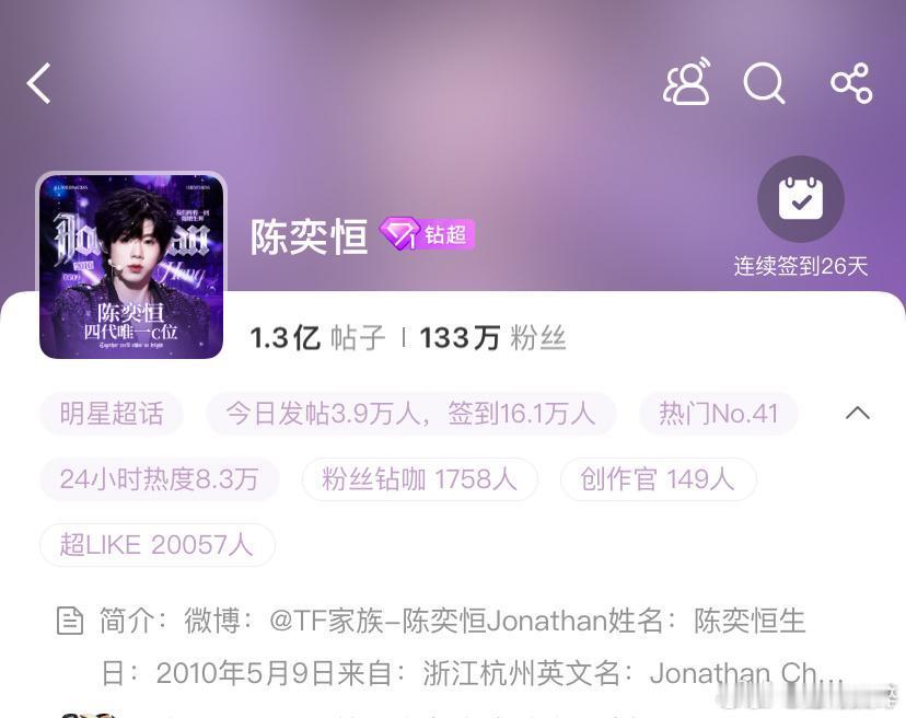 陈奕恒四代首位解锁超话破20000超like成就,实力与人气双认证✨