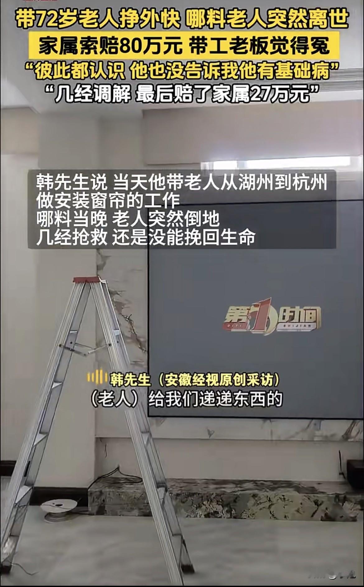 倒大霉了!72岁老人跟着老板“挣外快”猝死,家属索赔80万。 陈伯是杭州一栋写字楼的看门人,72岁,话不多,见人总是点点头。韩老板的公司就在楼上,日子久了,两人熟络起来。韩老板时不时有些零活,给人装窗帘、搬点小东西,就会叫上陈伯搭把手。递个螺丝刀,扶一下梯子,一天忙完,韩老板会塞给他一两百块钱。这对陈伯来说,是一份不错的额外收入。两人从没签过任何东西,全凭口头一句话。 那天下午,韩老板要去杭州给一户新房子装窗帘。他照例敲了敲窗:“陈伯,下午有个活,去吗?”陈伯从门卫室探出身,点点头,换了件干净些的外套就上了韩老板的车。路上,韩老板说起这户人家窗户多,活有点赶。陈伯靠在座椅上,回了句:“没事,慢慢做。” 到了地方,两人开始干活。韩老板在梯子上安装轨道,陈伯在下面把窗帘一片片递上去,再把地上的包装纸收拾整齐。房子里还空荡荡的,说话都有回音。期间,陈伯擦了几次汗,动作比往常慢了些,韩老板在上面问:“累了吧?歇会儿。”陈伯摆摆手:“不累,就是有点闷。” 谁都没想到,这句“有点闷”是不太对劲的开始。就在活计快要收尾,陈伯弯腰去卷最后一大块塑料包装膜时,他忽然踉跄了一下,然后整个人直接栽倒在那堆柔软的窗帘布上,没发出什么声响。 韩老板一开始还以为他被绊倒了,喊了一声没反应,才觉得不对。他爬下梯子,看到陈伯脸色发灰,怎么叫都没动静。韩老板脑子“嗡”的一声,手忙脚乱地打电话叫急救,声音都是飘的。在等救护车来的那段时间里,他蹲在旁边,不知所措。救护车的声音由远及近,格外刺耳。 医院最终没能留住陈伯。医生的说法是,突发疾病,可能与劳累有关。这个消息,像一块冰冷的石头,砸碎了两个家庭的平静。 陈伯的老伴听到消息,当时就站不住了,被亲戚扶着,眼泪都流不出来。儿子从外地赶回来,眼睛赤红,见到韩老板的第一句话就是:“我爸身体一向好好的,怎么跟你出去干个活,人就没了?!”好好的。这个词,后来成了双方争执的一个关键。陈伯的家人坚持认为,老人身体硬朗,没事。 韩老板则被一种巨大的冤屈和慌乱淹没了。他对着陈伯的家人,也对着后来来调解的人反复解释:“我真的不知道他身体有什么问题啊!他就帮我递递东西,这活能有多累?我就是好心,想让他赚点零花钱……”他觉得,这顶多算是熟人之间的帮忙,自己怎么就成了要对一条人命负全责的人? 悲伤和委屈无法对话。陈伯家人提出了80万元的赔偿,这是一个包含了愤怒、痛苦和对未来无着落的数字。对韩老板来说,这无疑是个天文数字,他觉得自己承受不起,也不该这样承受。 于是,双方坐在了调解室里。气氛冰冷僵硬。陈伯家人讲述老人的勤劳、本分,讲述家庭的崩塌。韩老板讲述自己的无心之失、经济压力和满腹委屈。80万这个数字悬在中间,谁也够不着谁。 调解不是一次就成的。每次协商,对双方都是一次煎熬。赔偿的数额从80万开始往下松动,但每降一点,都伴随着艰难的拉锯和眼泪。韩老板在这个过程中,也许才慢慢体会到,他眼里“递东西的轻活”,对一个72岁的老人而言,可能意味着什么。而陈伯的家人,可能也逐渐看清了眼前这个同样被这件事压得喘不过气的男人,并非恶徒。 最终,达成了一个双方都能勉强接受的数字:27万元。韩老板同意了,他说:“这个事情因我而起,我认。” 陈伯家人也签了字。27万,买不回一条命,也填不满失去亲人的缺口,它只是一个让这件事在法律和世俗层面能够翻篇的、沉重的数字。 事情了结后,写字楼下的门卫室很快来了新的看门人。韩老板的公司照常运营,只是他进出大门时,总会不自觉地加快脚步。那27万,结清了一笔账,但有些画面,比如陈伯最后倒在窗帘布上的样子,大概会留在他心里很久。 大家怎么看这件事?你觉得这个结果,对谁更公平一些?