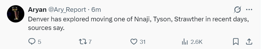 虎扑02月06日讯美记Ary发文表示:掘金正探索送走纳吉、泰森、斯特劳瑟三人其中之一。
