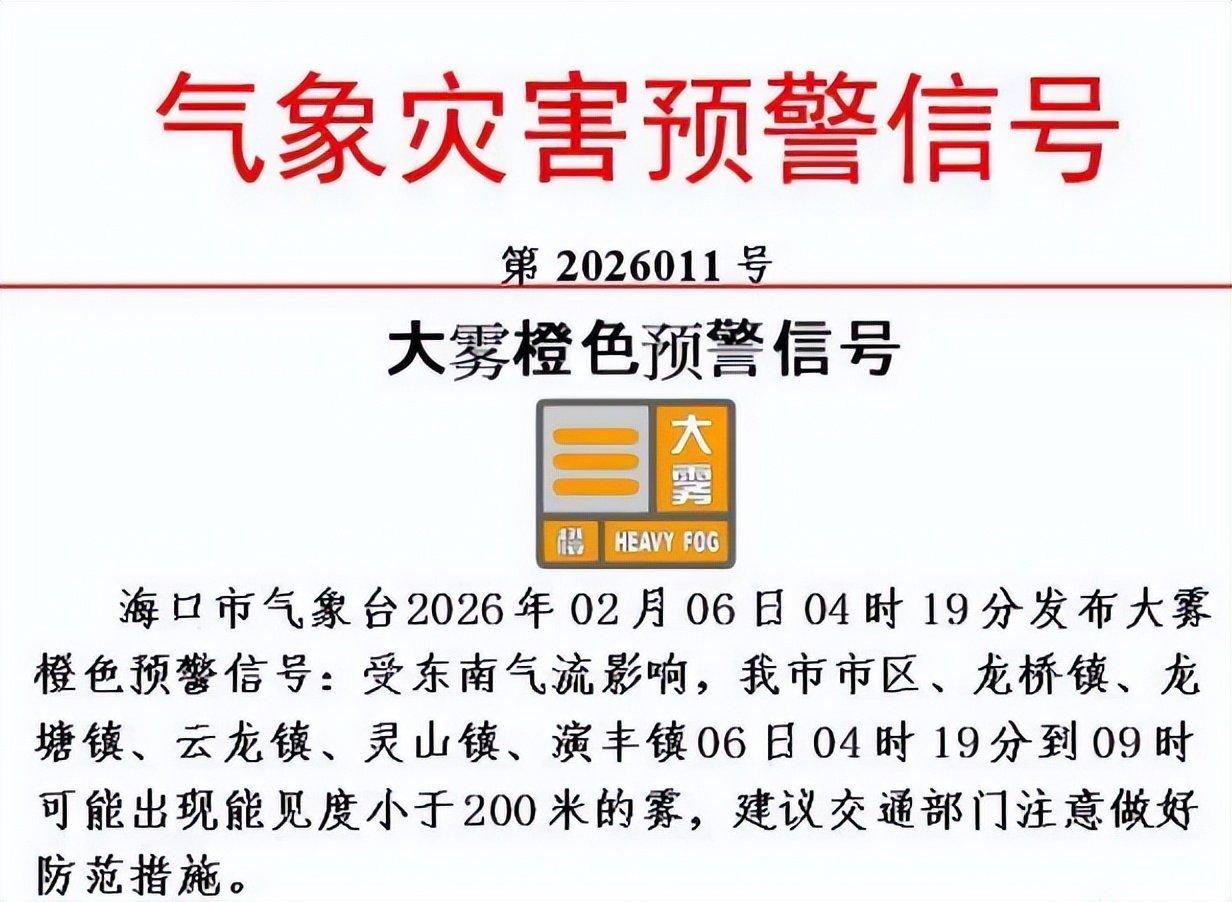 受东南气流影响,海口市市区、龙桥镇、龙塘镇、云龙镇、灵山镇、演丰镇等,6日4时19分到9时可能出现能见度小于200米的雾,建议交通部门注意做好防范措施。