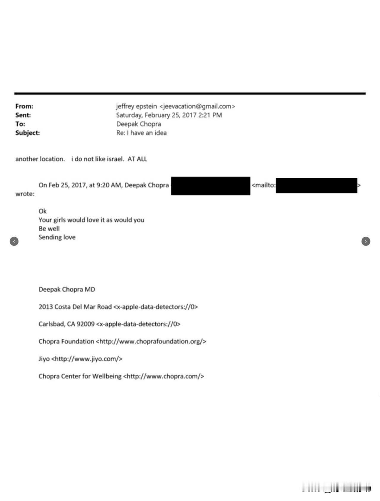 爱泼斯坦和迪帕克·乔普拉之间的另一封电子邮件往来浮出水面 。 著名印度灵修师迪帕克·乔普拉(其实就是某种印式气功,伪科学养生)的名字,在爱泼斯坦的档案中,出现了超过3300次 2017年的一封电子邮件中,迪帕克·乔普拉邀请爱泼斯坦前往以色列,并说:“如果你想的话,可以用假名。带上你的女孩们。” 后来,他又邀请爱泼斯坦参加华尔街的一场活动,并说:“如果方便的话,带上任何人,作为我的客人来吧。” 爱泼斯坦回复说,他当时在佛罗里达州,但他“想派两个女孩”参加活动