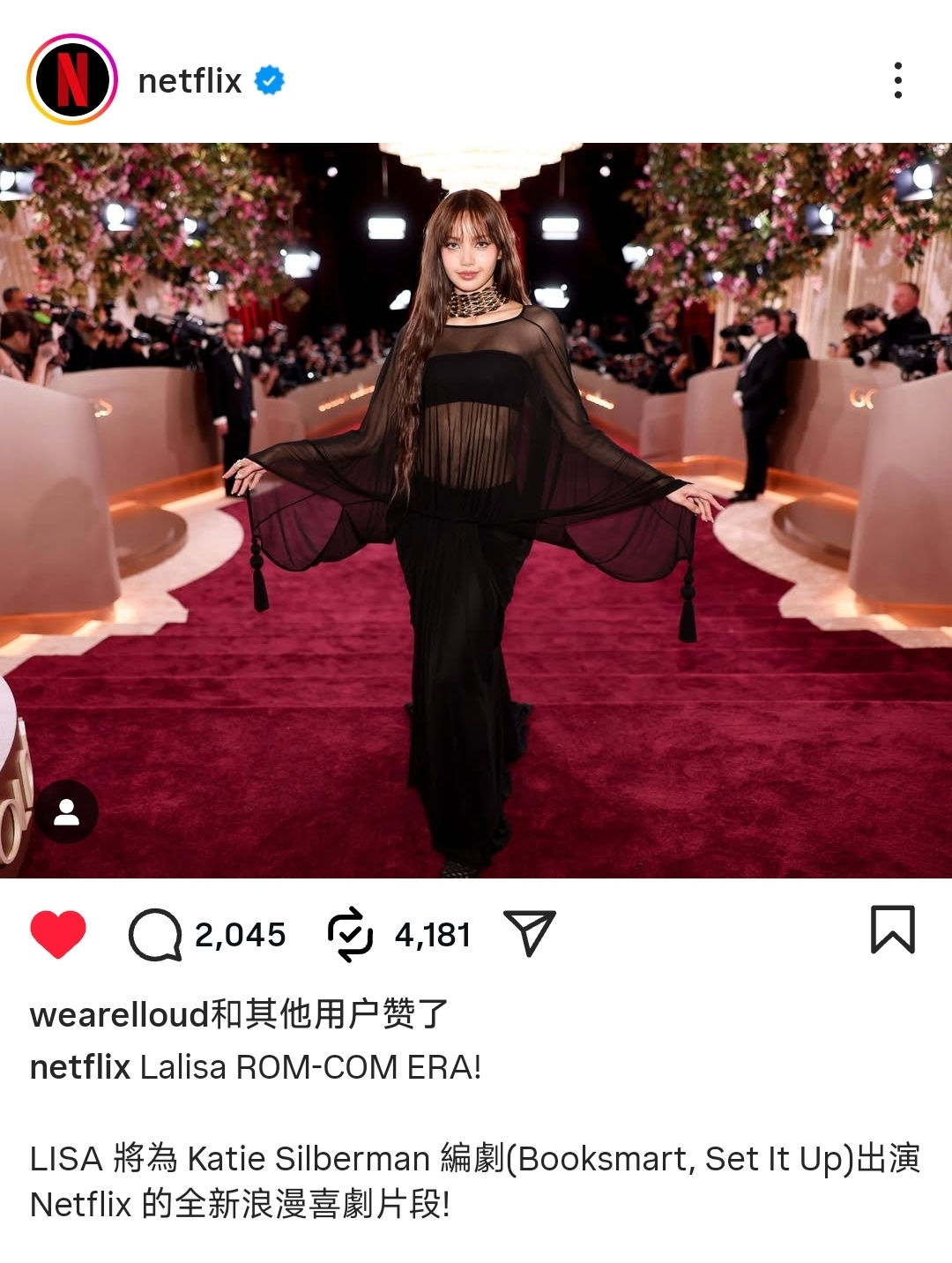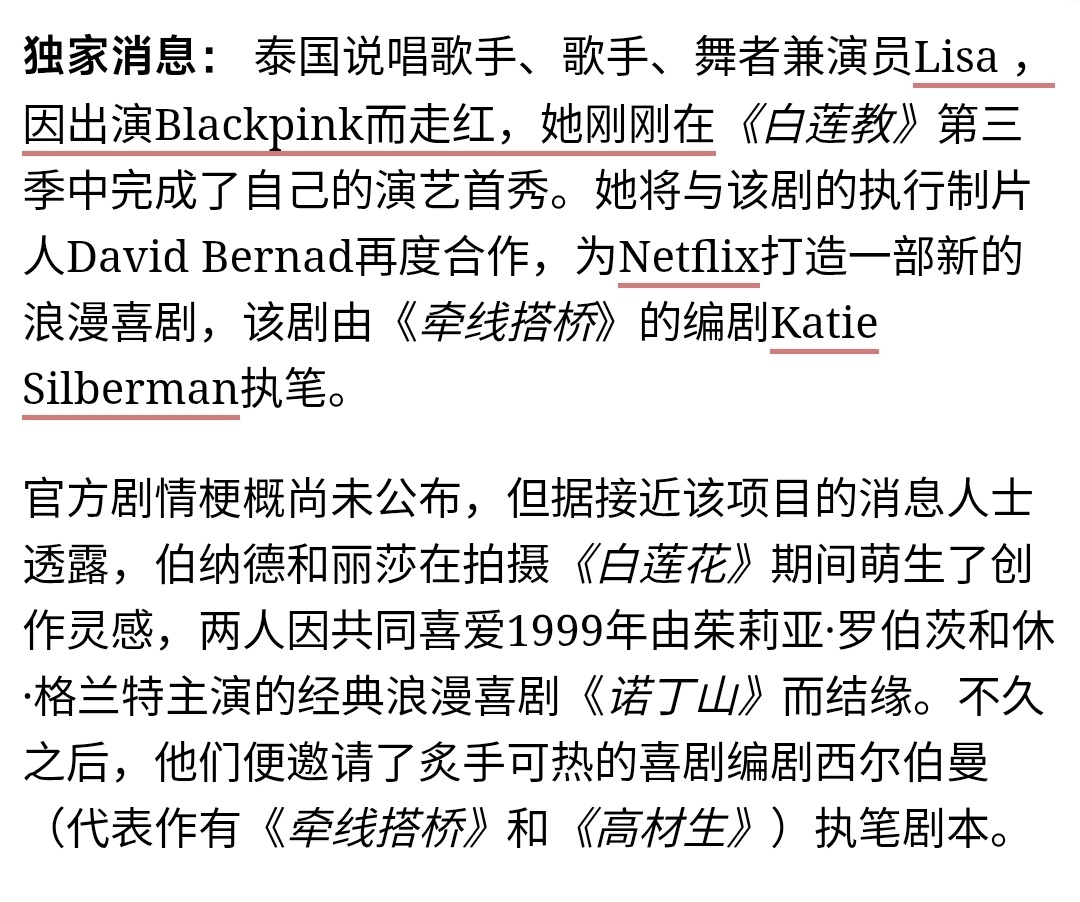 260206 Netflix宣布Lisa最新影视信息一则🎬“LALISA 浪漫喜剧时代!Lisa将与《白莲花度假村》的执行制片人David Bernad再度合作,主演 Netflix 出品的全新“诺丁山风格”浪漫喜剧电影,该片由 Katie Silberman(《高材生》、《牵线搭桥》)编剧!”“Lisa和Alice Kang将担任执行制片人!”妈呀浪漫喜剧,妈呀制片人,我爱死!!!!!这个女人一直在给人带来惊喜🤩🤩🤩