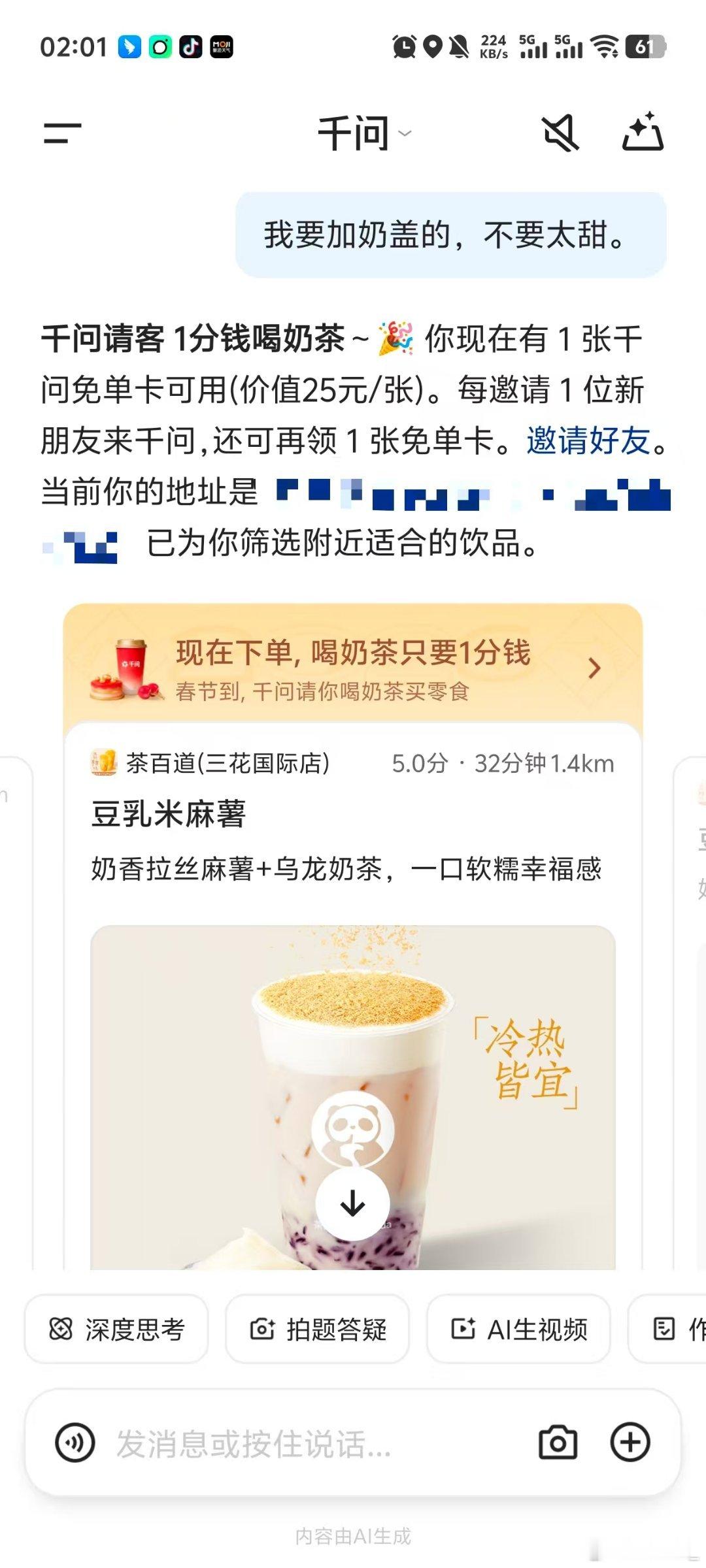 手把手教你薅千问免单奶茶刚到公司想喝点东西,又不想排队。突然想起千问这个“春节30亿大免单”活动,就打开APP对着它说“现在在商场,想快速自取一杯果茶”。AI根据我的位置推荐了最近门店,选了推荐的那家后,我授权绑定了🍑宝账号,下单时系统自动用了免单卡,最后只付了1分钱。走过去时饮料已经做好在等我了。朋友说这比平时点单方便太多,而且要是邀请新用户注册,还能多得免单卡,最多能攒21张呢。这波AI福利挺实在的。