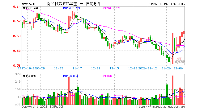 2月6日,食品饮料ETF华宝(515710)开盘跌0.50%,报0.602元。食品饮料ETF华宝(515710)重仓股方面,贵州茅台开盘涨0.00%,五粮液涨0.01%,伊利股份涨0.11%,泸州老窖涨0.02%,山西汾酒跌0.37%,海天味业跌0.16%,东鹏饮料跌0.73%,洋河股份跌0.50%,安琪酵母涨0.00%,今世缘跌0.03%。
