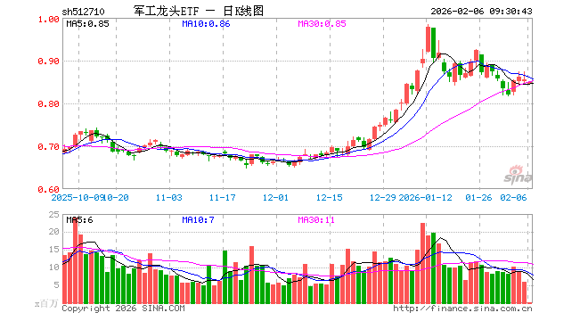 2月6日,军工龙头ETF(512710)开盘跌1.17%,报0.845元。军工龙头ETF(512710)重仓股方面,航天电子开盘跌1.84%,中国卫星跌2.07%,航发动力跌0.04%,中航沈飞跌0.73%,中航光电跌0.66%,中航西飞跌0.43%,西部超导跌0.74%,中航机载跌0.75%,海格通信跌0.46%,中科星图跌0.74%。