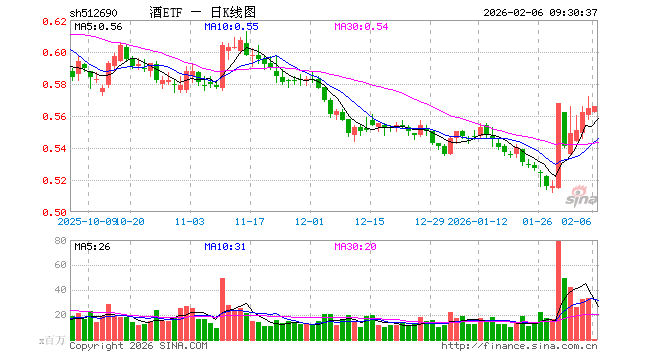 2月6日,酒ETF(512690)开盘跌0.53%,报0.562元。酒ETF(512690)重仓股方面,贵州茅台开盘涨0.00%,五粮液涨0.01%,泸州老窖涨0.02%,山西汾酒跌0.37%,洋河股份跌0.50%,今世缘跌0.03%,青岛啤酒跌0.36%,古井贡酒跌1.03%,燕京啤酒跌0.47%,舍得酒业跌2.15%。
