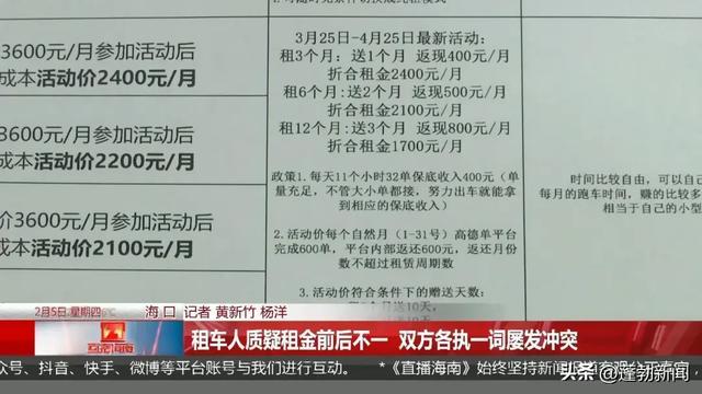 海口雄狮快跑汽车租赁有限公司负责人:我们讲的是活动价,租3个月送1个月,租1年是我们送4个月给他,然后打平均算下来再减去我们平台活动给他返现,这个金额折合下来1700元没有毛病,而且我们每张桌上都有这个纸(记者:每个月给他1700元的价格是吗)最终合计下来是1700元(记者:那他现在为什么说每个月3600元)3600元是我们原价3600元,没毛病啊(他要我实交3600元每个月)对啊,然后我给他送4个月,没毛病啊。