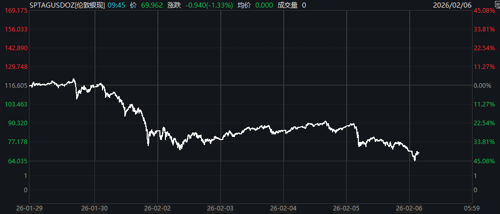 行情数据显示,现货白银在日内亚洲早盘时段一度下探至每盎司64美元,这意味着其较1月29日创下的历史高位121.65美元已近乎腰斩,而这之间仅间隔了相隔不到七个交易日。