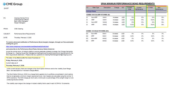 根据公告文件,CME此次将COMEX100黄金期货的初始保证金从8%上调至9%,将COMEX5000白银期货的初始保证金比例从15%上调至18%。