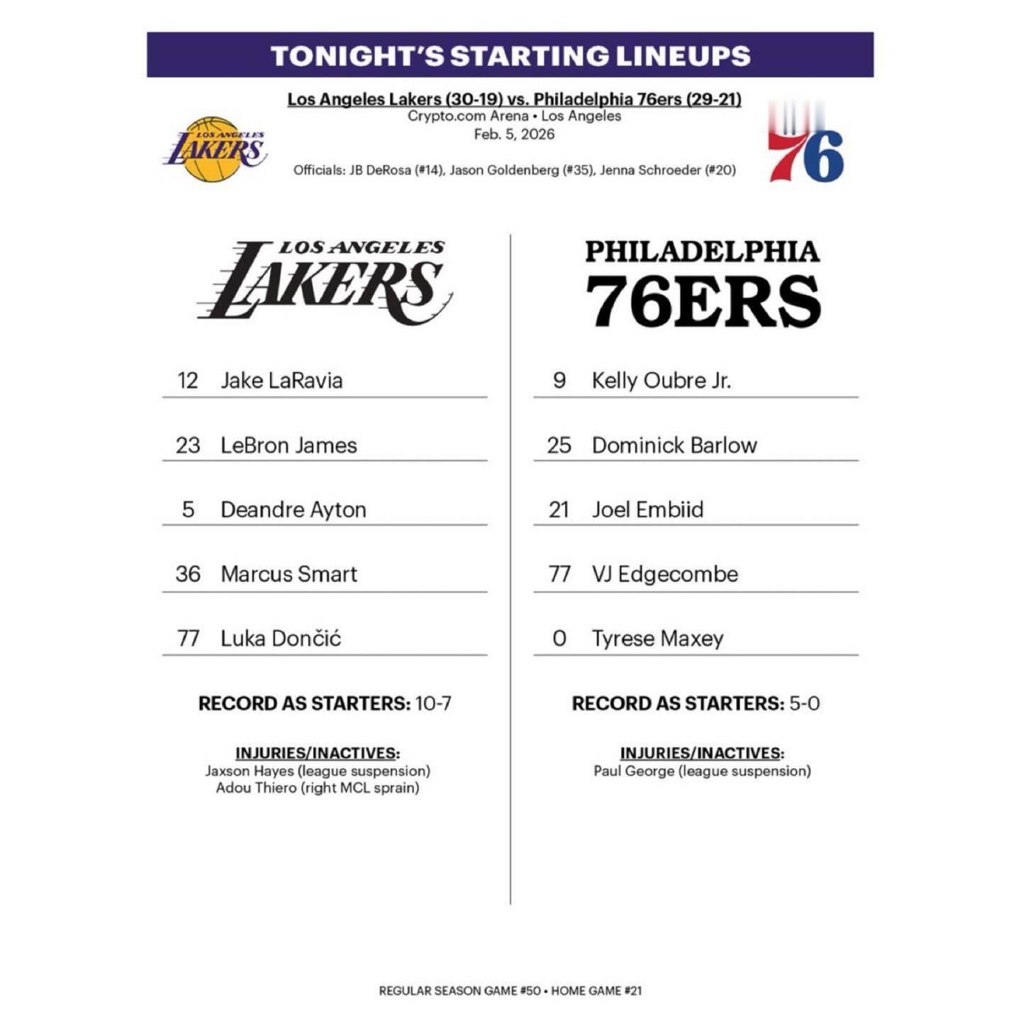 今日首发:东契奇、斯玛特、拉拉维亚、詹姆斯、艾顿!76人vs湖人洛杉矶湖人