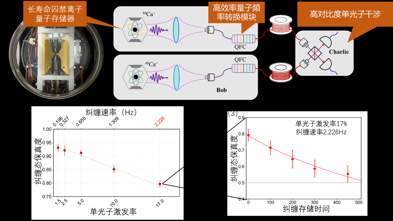 针对这一核心难题,中国科大研究团队通过发展长寿命囚禁离子量子存储器、高效率离子-光子通信接口及高保真度单光子纠缠协议,实现长寿命量子纠缠,纠缠寿命(550毫秒)显著超过纠缠建立所需的时间(450毫秒),从而成功构建了可扩展量子中继的基本模块,使得远距离量子网络成为现实可能。