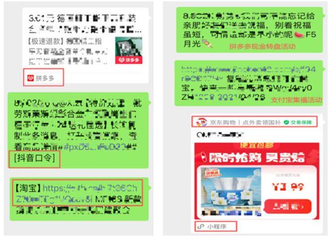 直到目前,新识研究所也尝试对京东、拼多多、淘宝、抖音等平台的营销推广、短视频播放或是红包获取活动进行了转发至微信的测试。
