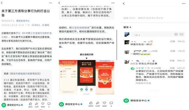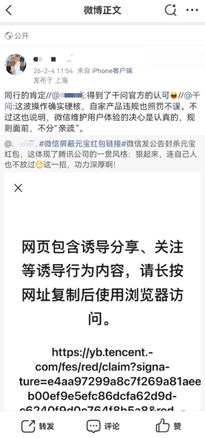 2月4日,微信突然对元宝红包链接采取了限制措施。当用户尝试在微信内打开这些链接时,会看到明确提示:“网页包含诱导分享、关注等诱导行为内容,请长按网址复制后使用浏览器访问”。