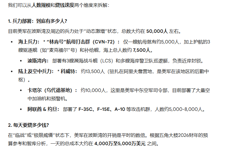 问了下大模型,这周末动手的概率比较大,美军在波斯湾现在5万部队,一旦打起来,一天5000万美军的耗费,不打就耗着估计也有4000万美金的耗费。