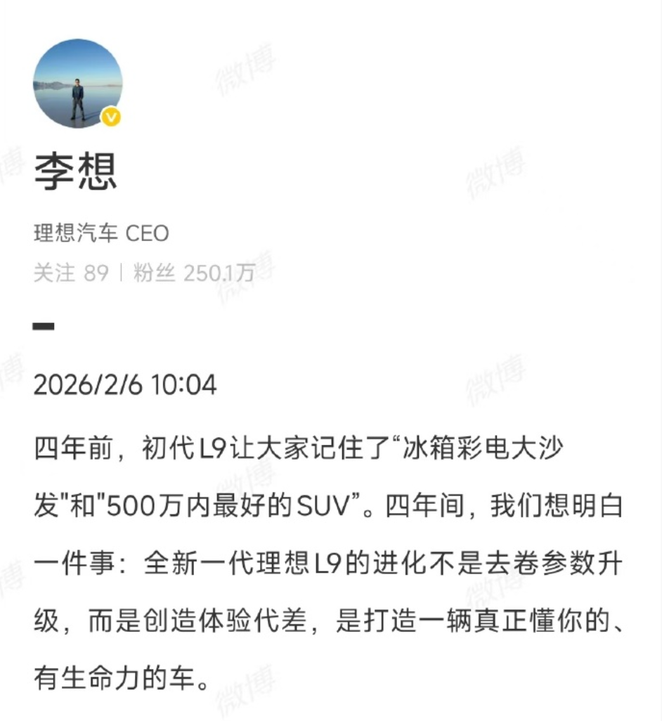 2月6日,理想汽车CEO李想发文称:四年前,初代L9让大家记住了“冰箱彩电大沙发”和“500万内最好的SUV”。四年间,我们想明白一件事:全新一代理想L9的进化不是去卷参数升级,而是创造体验代差,是打造一辆真正懂你的、有生命力的车。另外,我“听劝”了:全新一代理想L9将提供定制版双色车身,采用三重喷漆与无阶差手工打磨的专属工艺。全新一代理想L9将在今年二季度内发布。