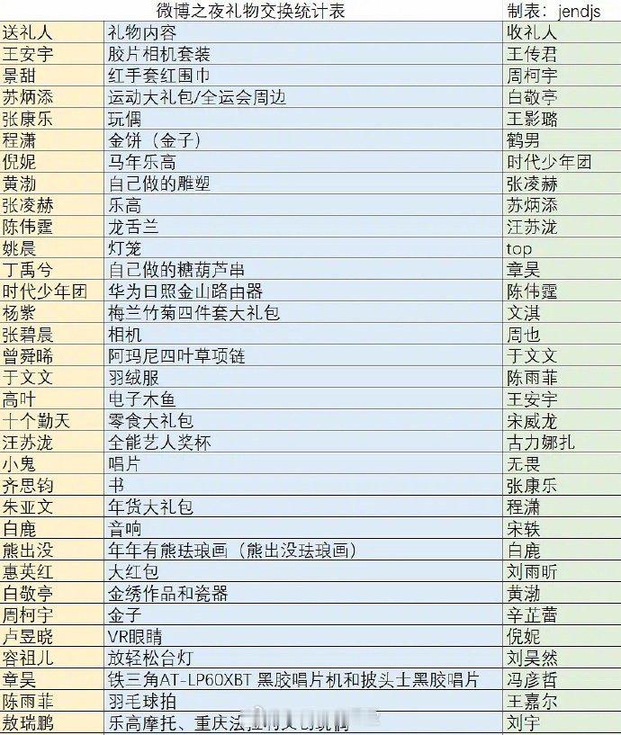 微博之夜交换礼物统计表,有的人是否太敷衍了……