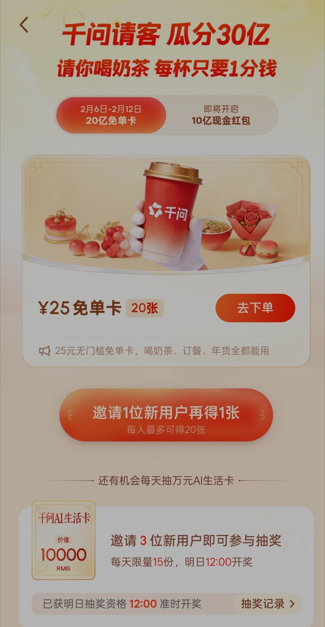 千问回应免费奶茶活动已领满20张 一共21杯不过也可以点别的 大家不用局限于奶茶