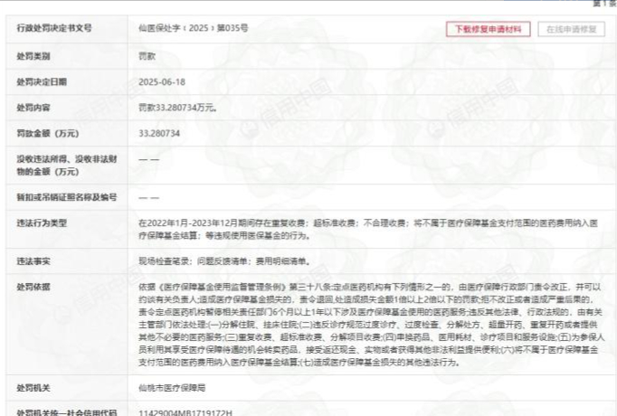 2025年6月份,子公司仙桃爱尔眼科医院有限公司又被查处,该医院在2022年1月-2023年12月期间存在重复收费、超标准收费、不合理收费,以及将不属于医疗保障基金支付范围的医药费用纳入医疗保障基金结算等违规使用医保基金的行为,最终被处以33.28万元的重罚。